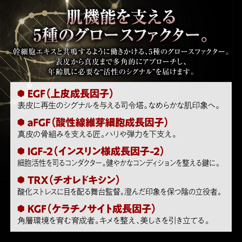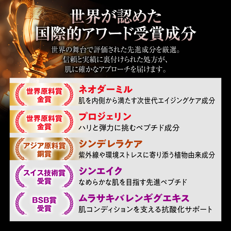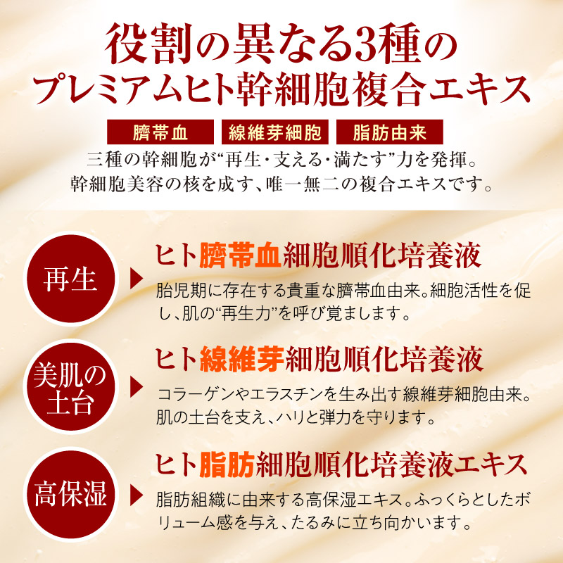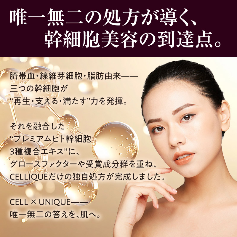 プレミアムヒト幹細胞3種複合エキスが、年齢とともに衰える肌の再⽣⼒にアプローチし、内側から押し返すようなハリと弾⼒を呼び戻します。さらに国際アワード受賞成分5種が、シミやくすみを和らげ、透明感に満ちた明るい印象へ。